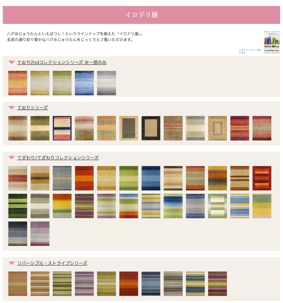 ハグみじゅうたん展は限定のておりシリーズや、てざわりCOLLECTIONシリーズ全柄がご覧いただける特別なイベントです。