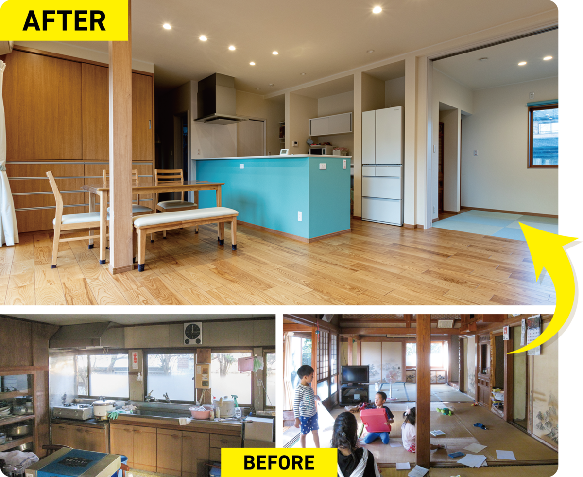 住宅設備を一新し、ダイニングキッチン(DK)と和室をつなげて、広々としたリビングダイニングキッチン(LDK)へ!