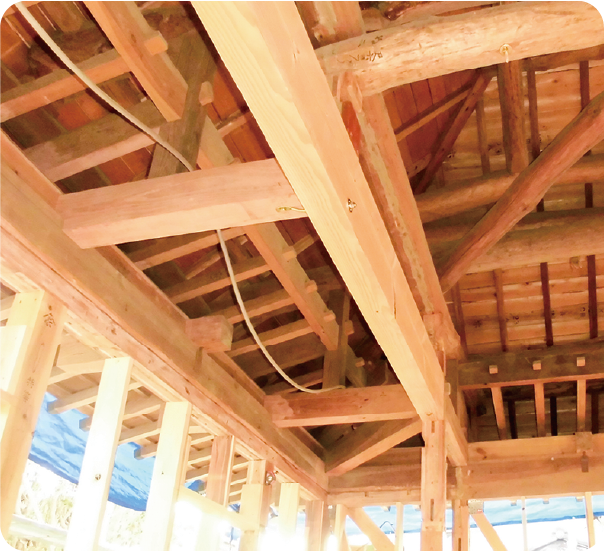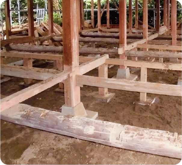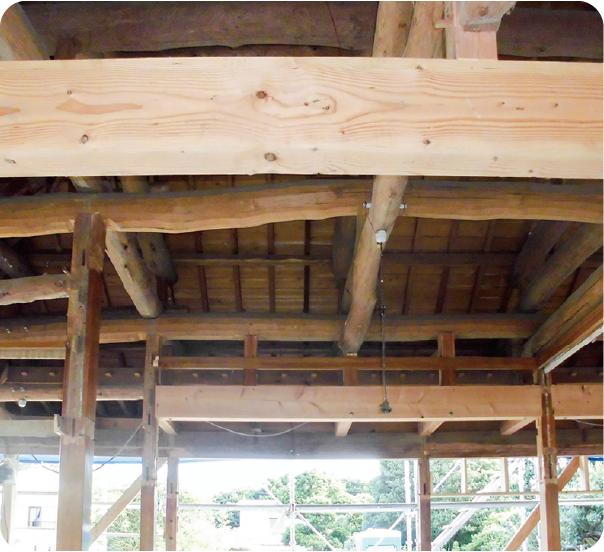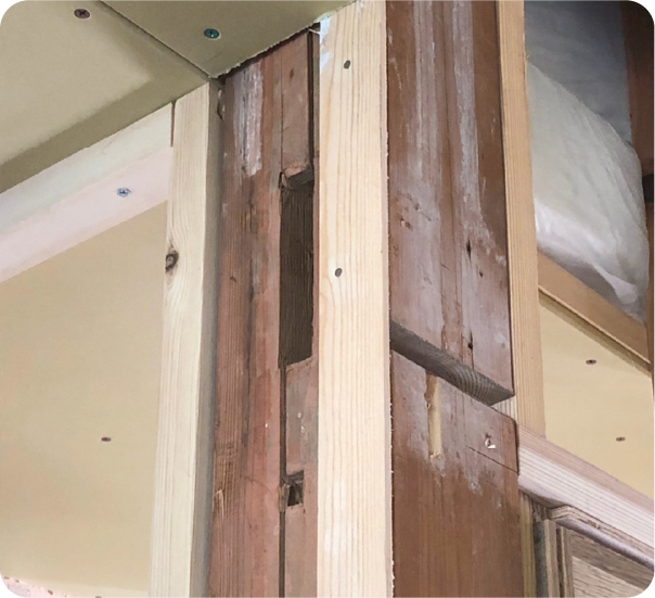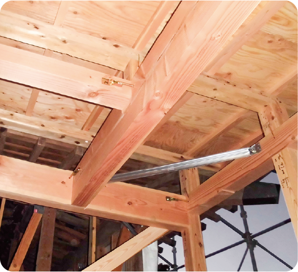 経年劣化により曲がっていた柱や、欠損が見られる部分 は立て直しや金物、 耐力壁を追加しました。