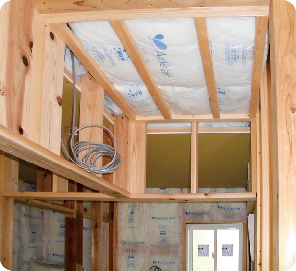 床下、壁、 外壁、天井など、 熱の逃げやすい箇所に断熱材を隙間なく敷き詰めて断熱・気密効果を高めています。